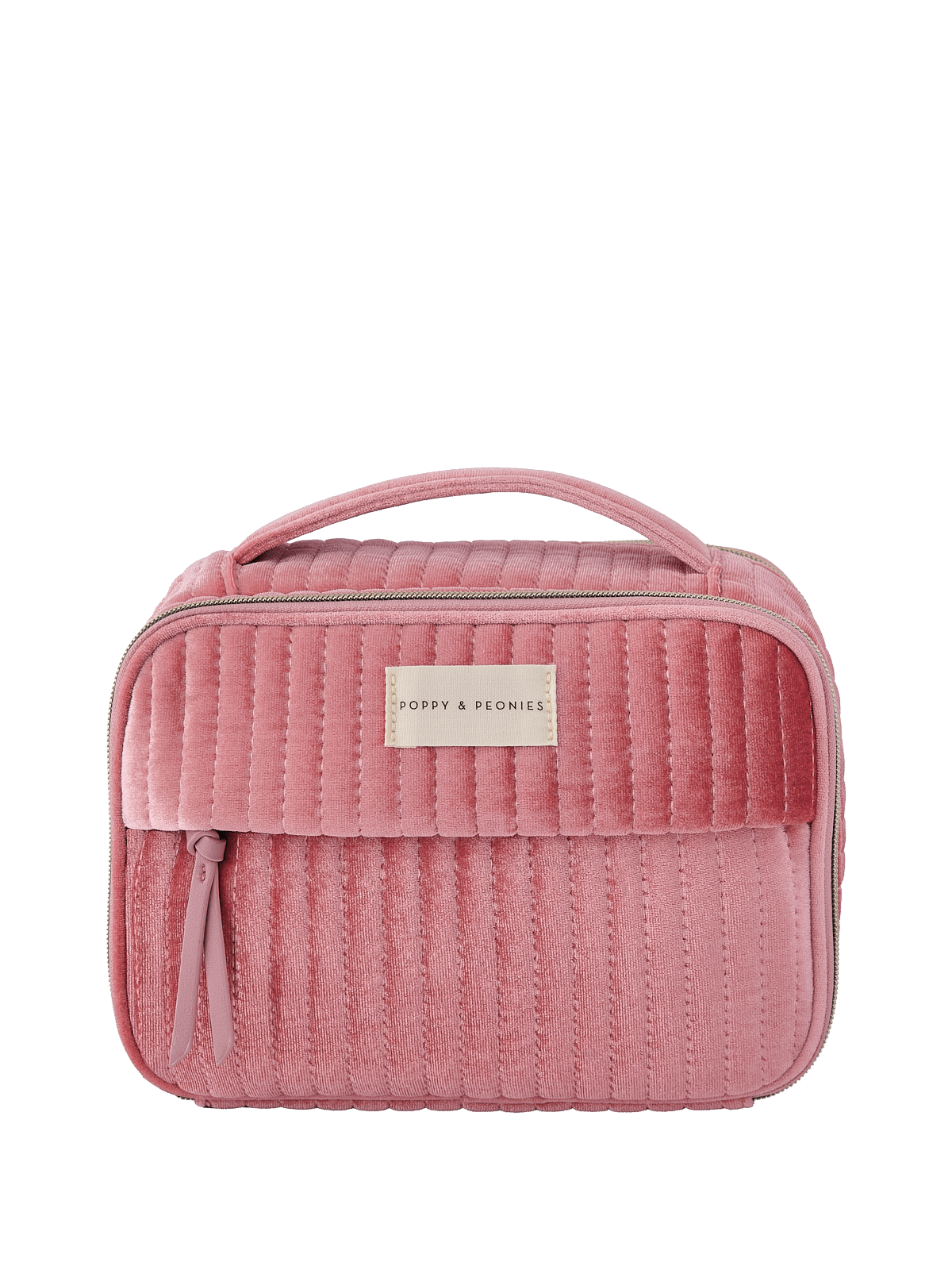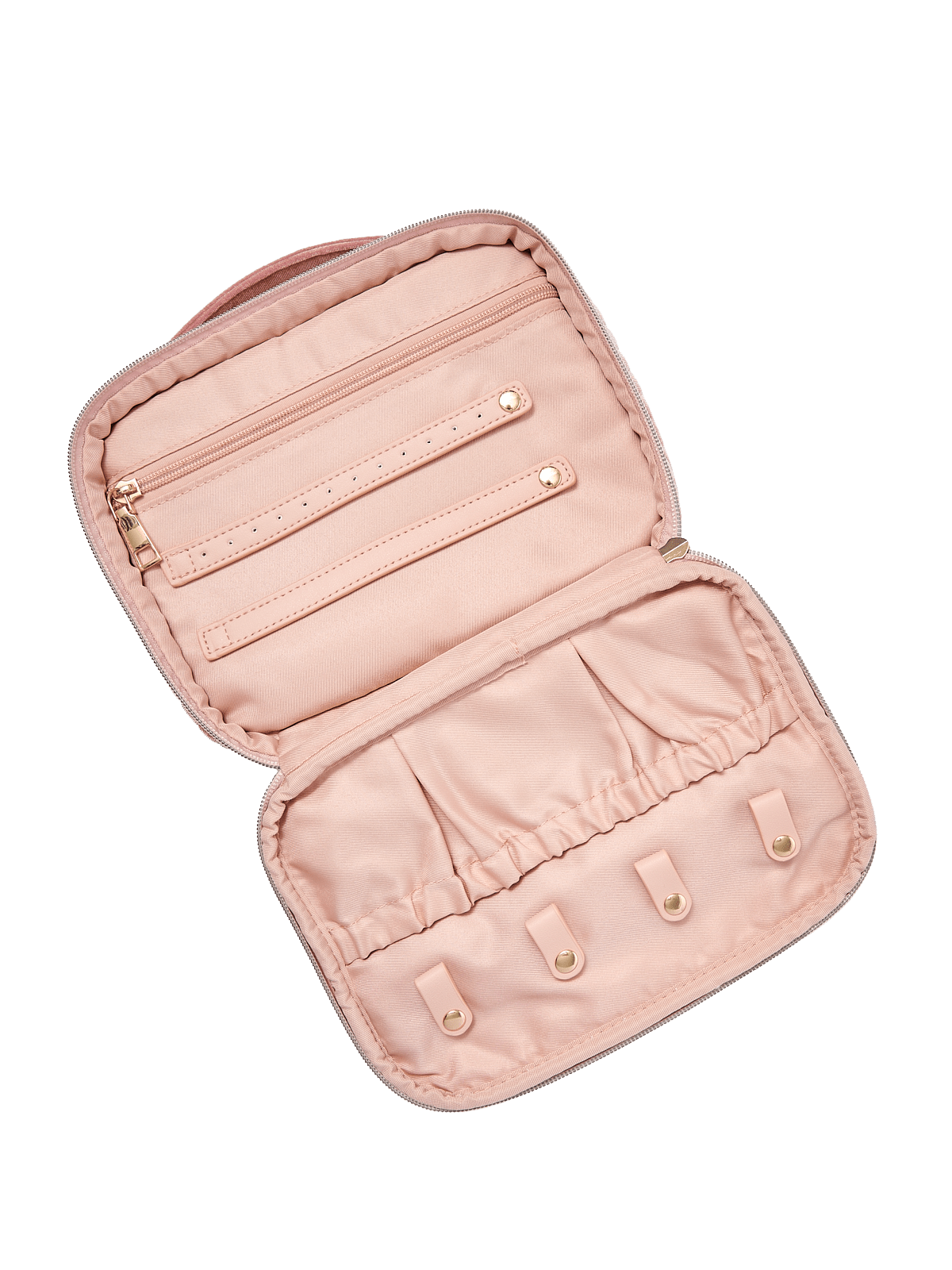 Practical, pretty, and oh-so-organized! With two separate compartments, one for your cosmetics and one for your jewelry, you get the perfect companion all in one case. The main compartment has plenty of room for all your lotions and potions, and features a wipeable lining, mesh pockets and a zipper pocket. The front compartment is a jewelry case with dedicated spots for your rings, necklaces, and delicate items, all kept safe with a zipper pocket. This is the beauty bag your holiday glam routine has been waiting for!