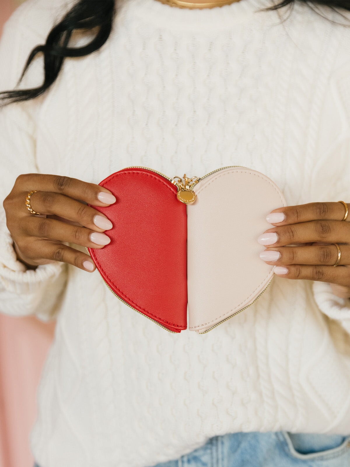 Heart-shaped red and pink coin pouch held by a person wearing a white sweater.