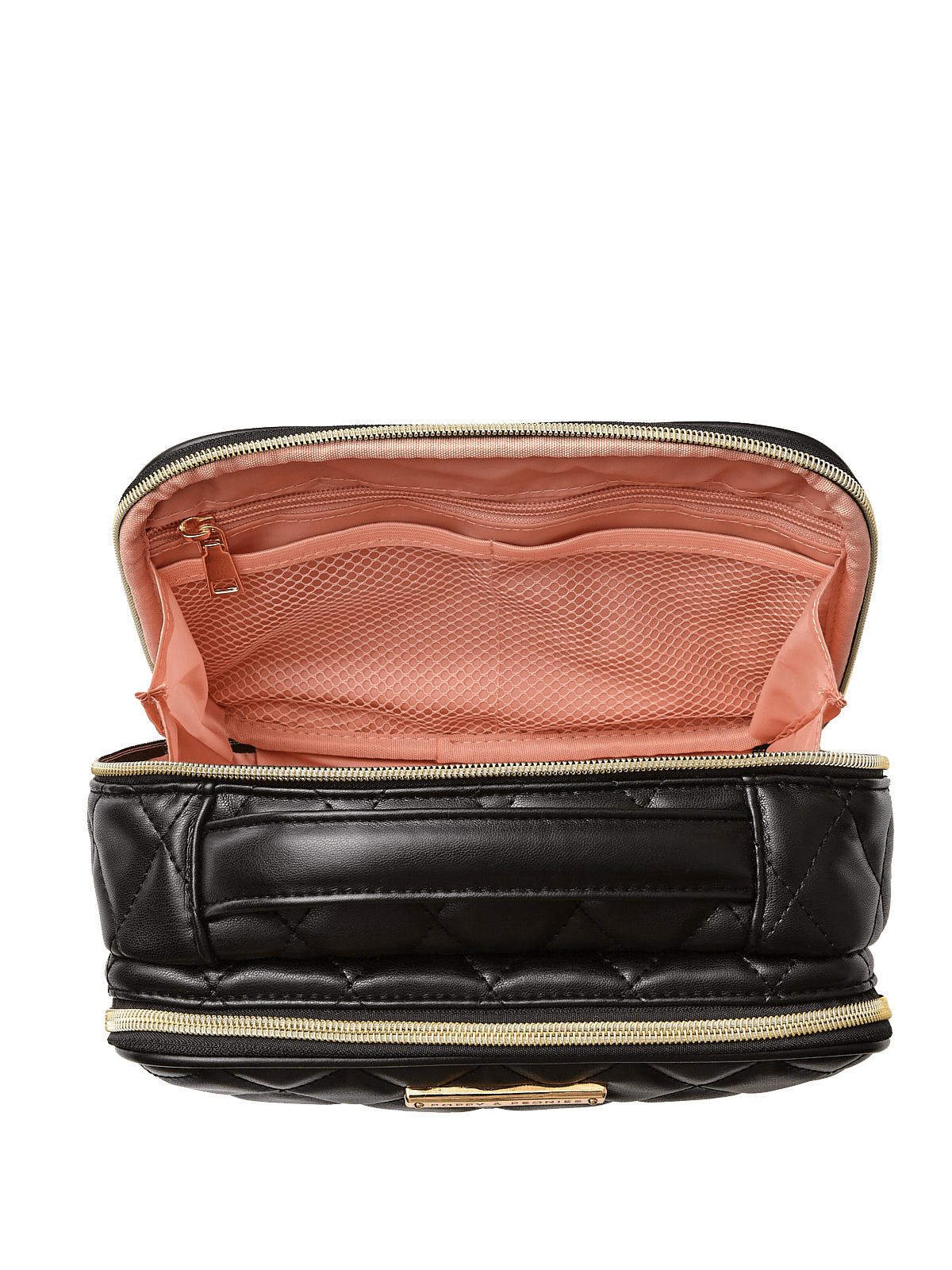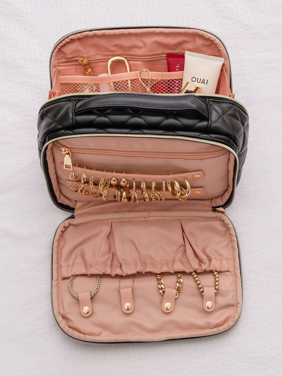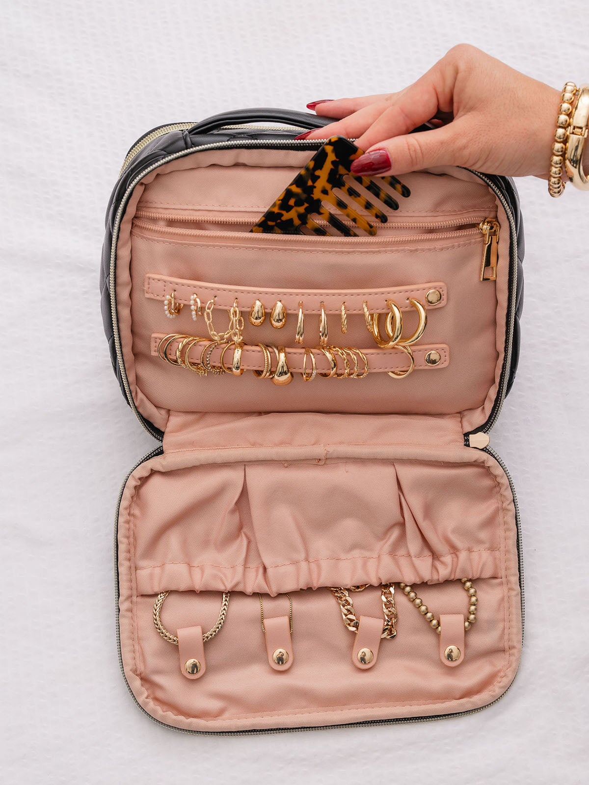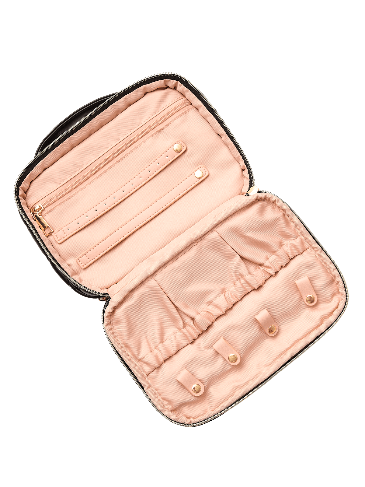 Practical, pretty, and oh-so-organized! With two separate compartments, one for your cosmetics and one for your jewelry, you get the perfect companion all in one case. The main compartment has plenty of room for all your lotions and potions, and features a wipeable lining, mesh pockets and a zipper pocket. The front compartment is a jewelry case with dedicated spots for your rings, necklaces, and delicate items, all kept safe with a zipper pocket. This is the beauty bag your holiday glam routine has been waiting for!