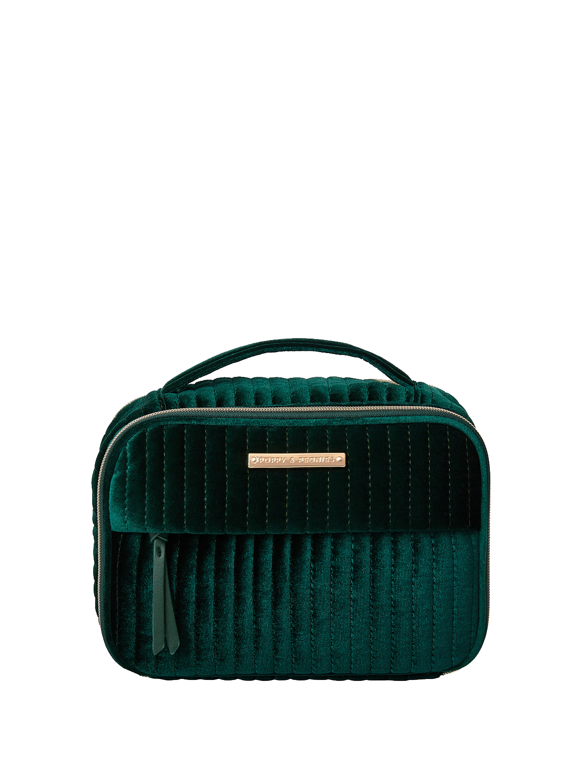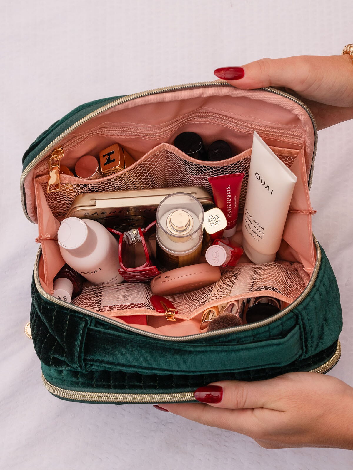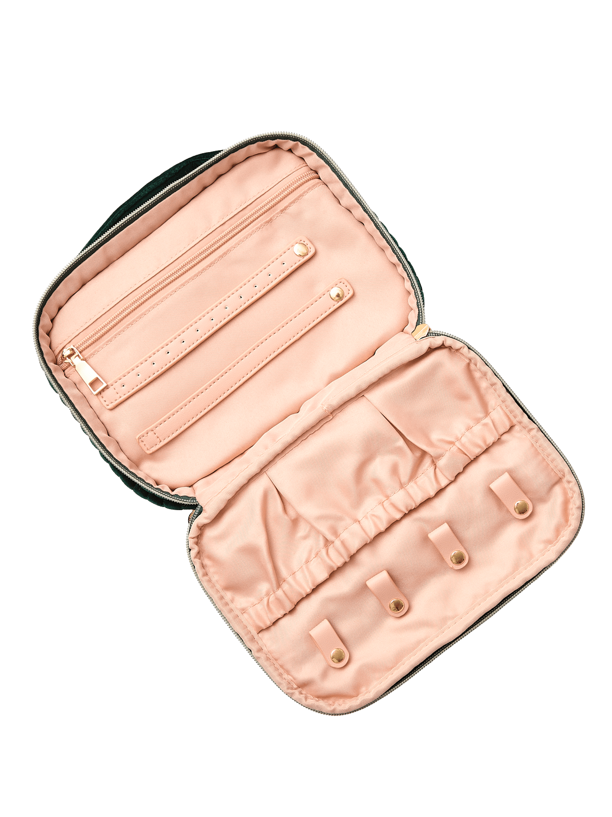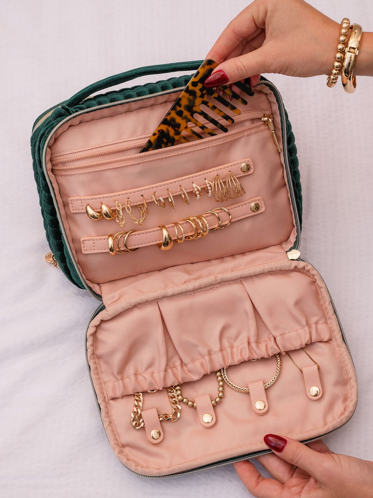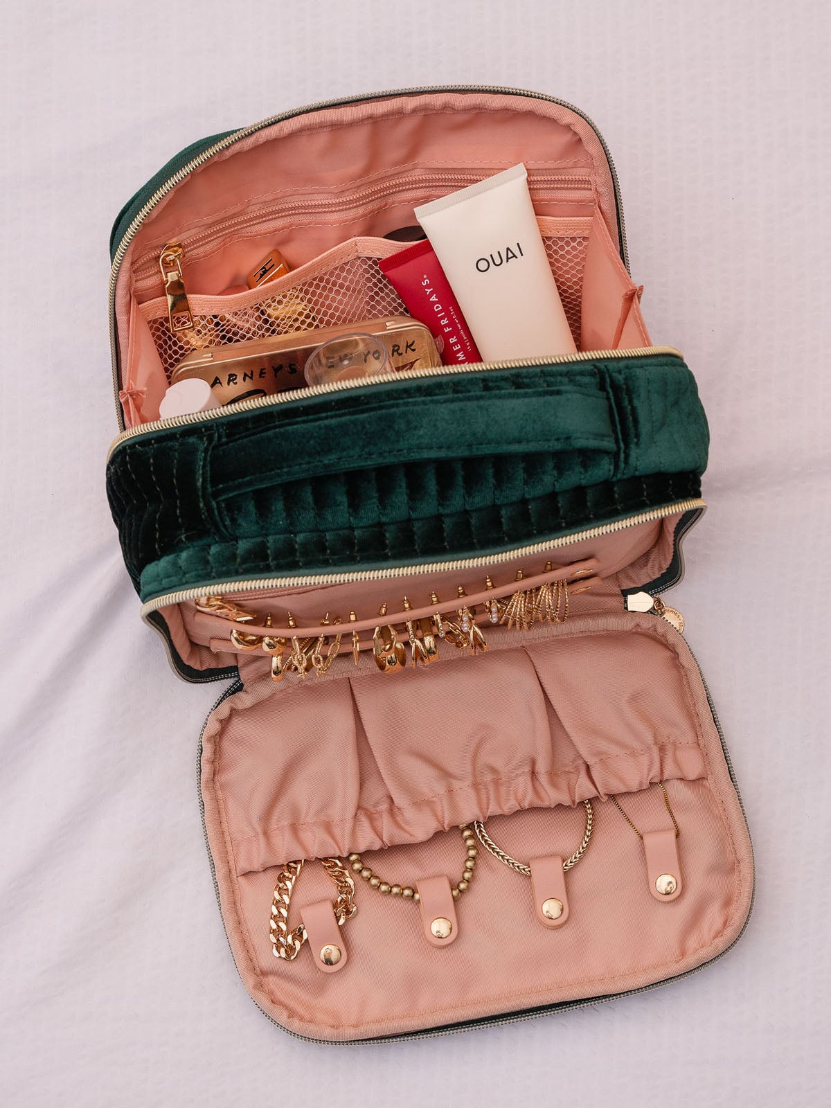 Practical, pretty, and oh-so-organized! With two separate compartments, one for your cosmetics and one for your jewelry, you get the perfect companion all in one case. The main compartment has plenty of room for all your lotions and potions, and features a wipeable lining, mesh pockets and a zipper pocket. The front compartment is a jewelry case with dedicated spots for your rings, necklaces, and delicate items, all kept safe with a zipper pocket. This is the beauty bag your holiday glam routine has been waiting for!