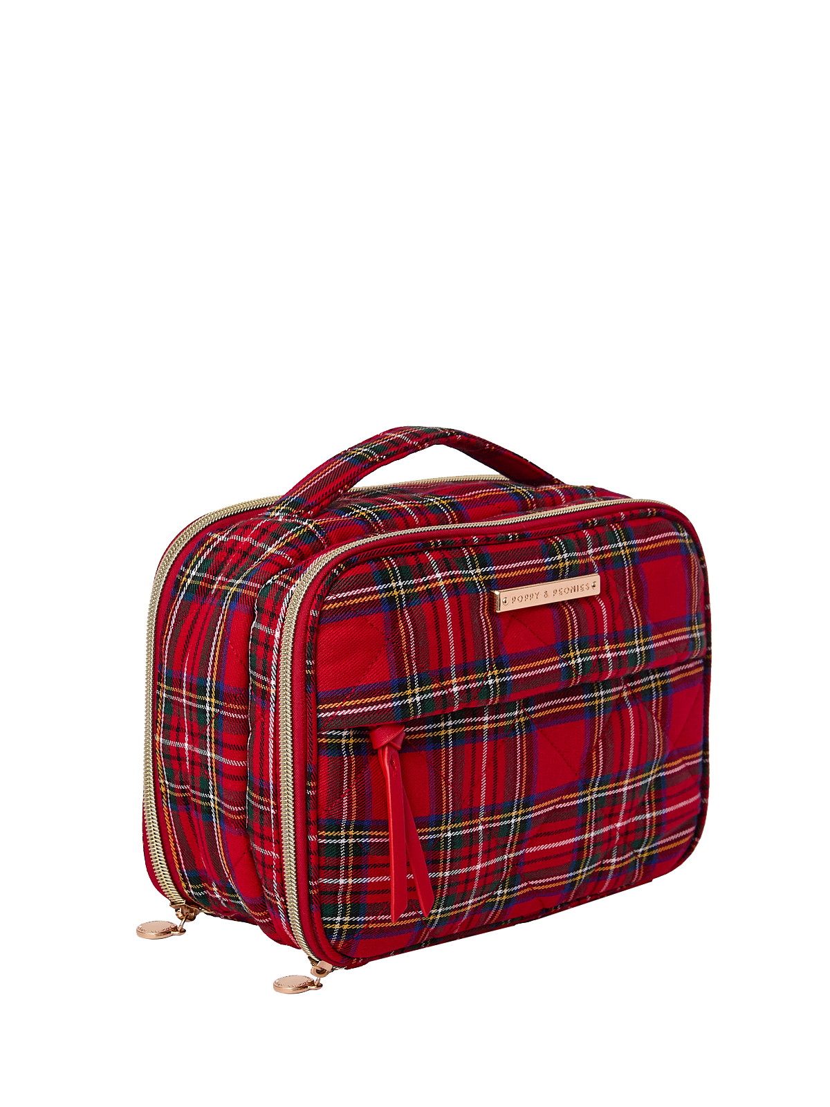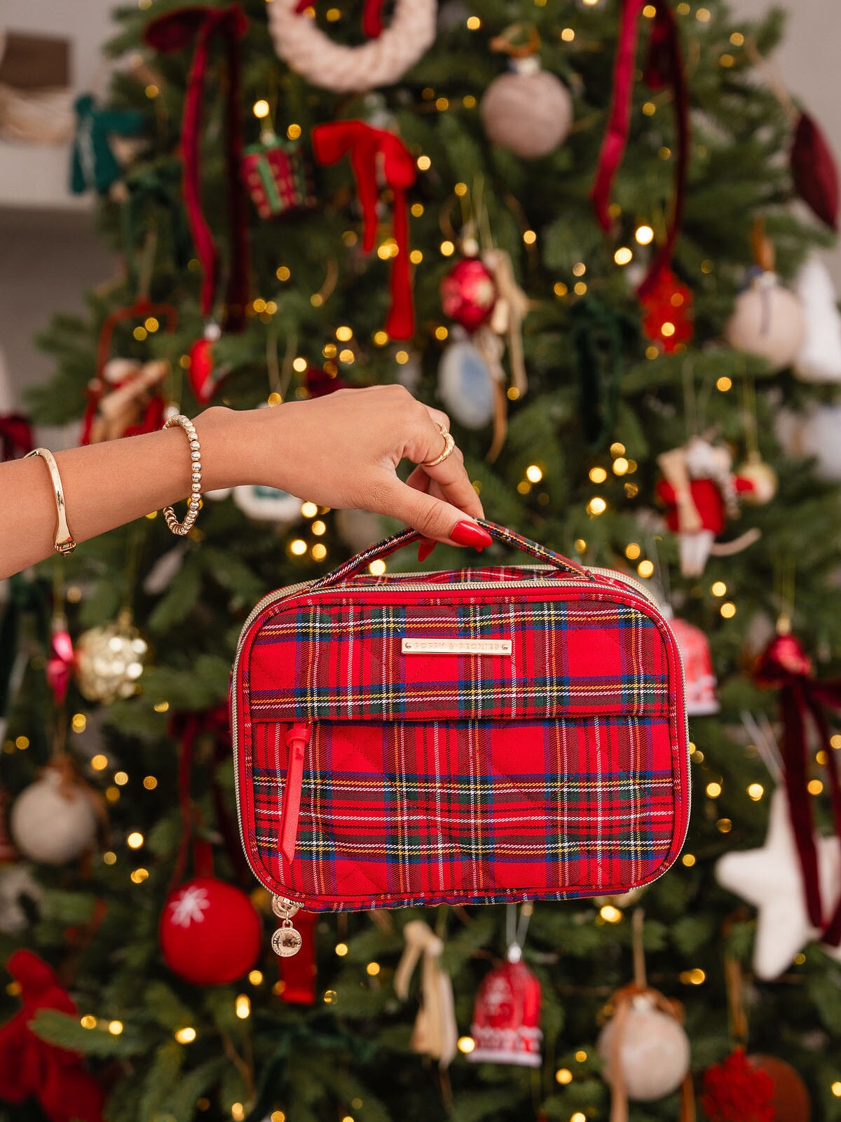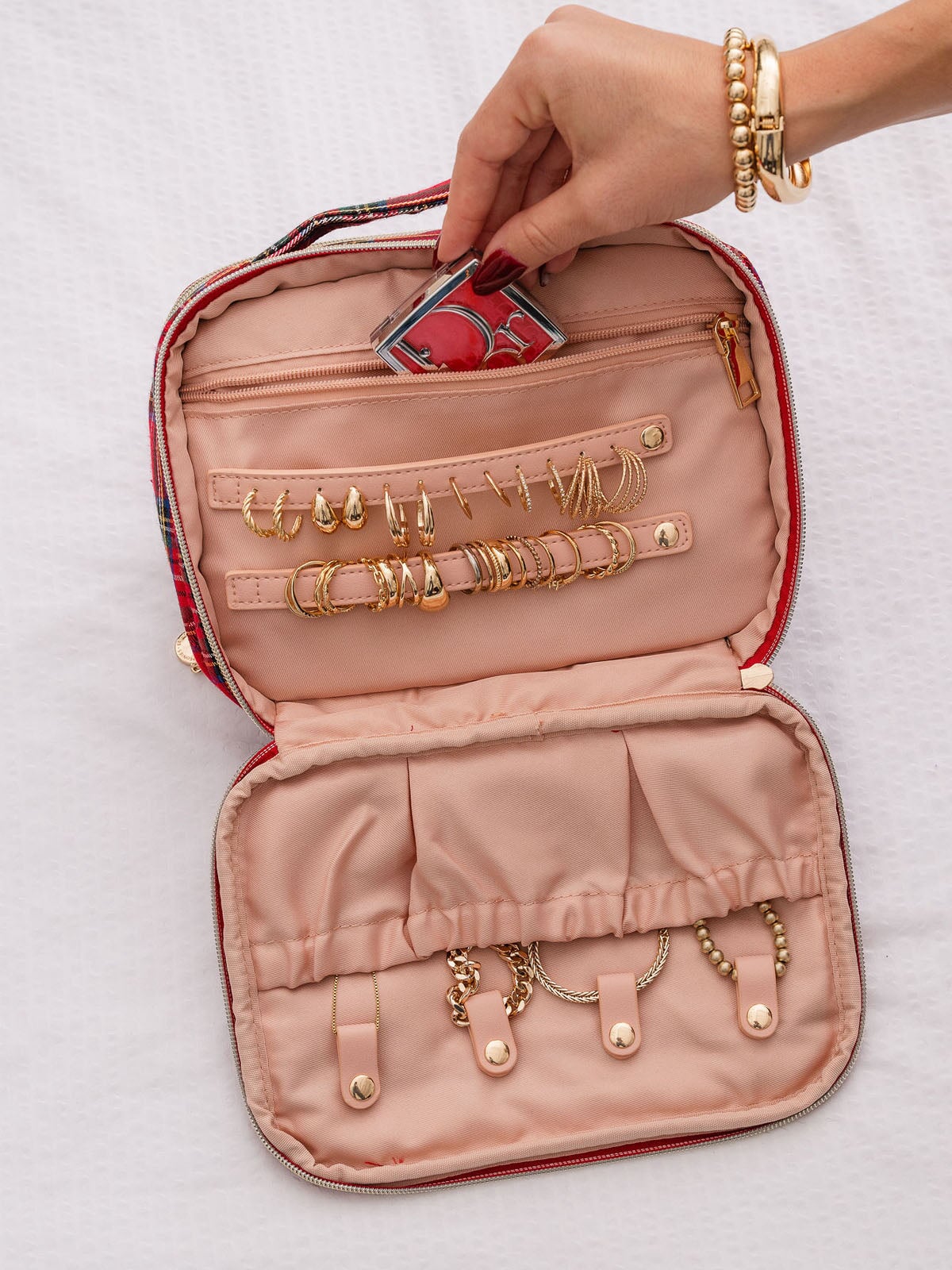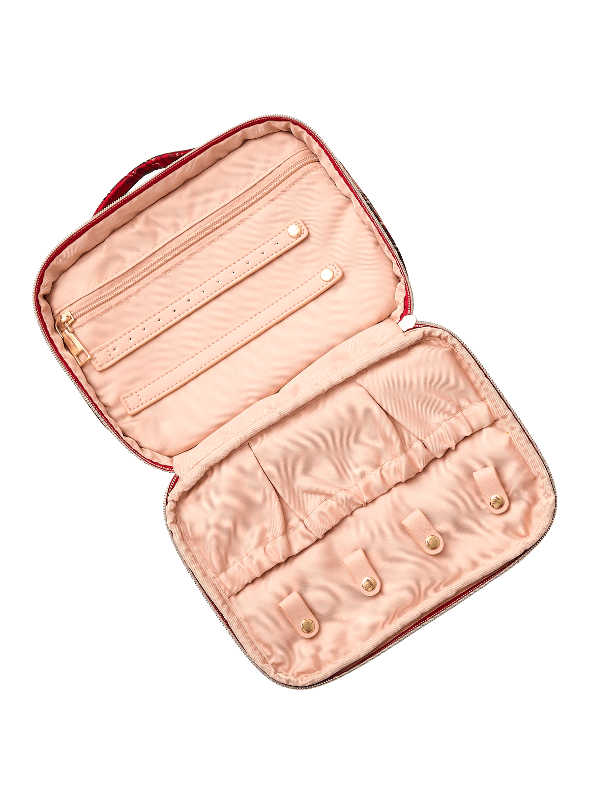 Practical, pretty, and oh-so-organized! With two separate compartments, one for your cosmetics and one for your jewelry, you get the perfect companion all in one case. The main compartment has plenty of room for all your lotions and potions, and features a wipeable lining, mesh pockets and a zipper pocket. The front compartment is a jewelry case with dedicated spots for your rings, necklaces, and delicate items, all kept safe with a zipper pocket. This is the beauty bag your holiday glam routine has been waiting for!