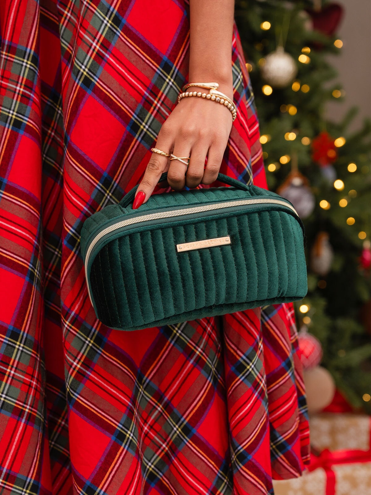 A quilted makeup bag so versatile, you'll wonder how you ever went without it. A must-have for any traveller, this festive makeup bag has a wipeable lining with two large interior compartments, interior slide pockets, a transparent centre compartment, as well as a jewelry tab to keep you organized.