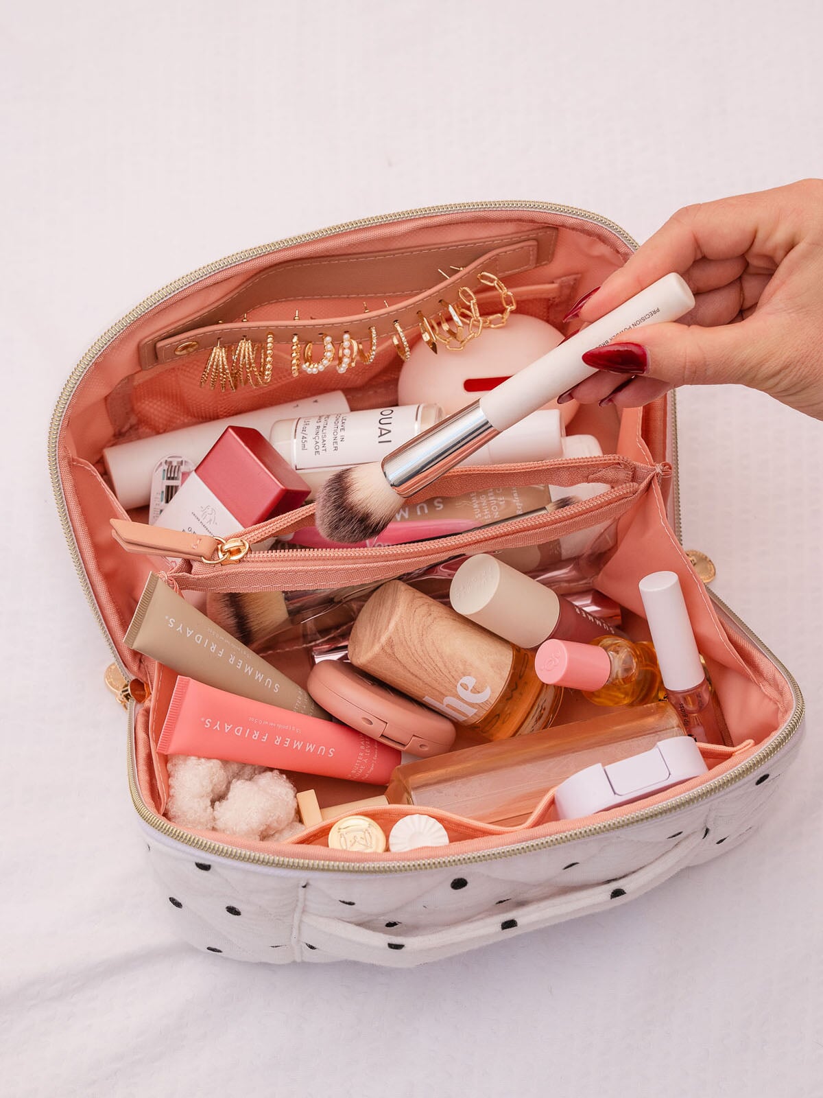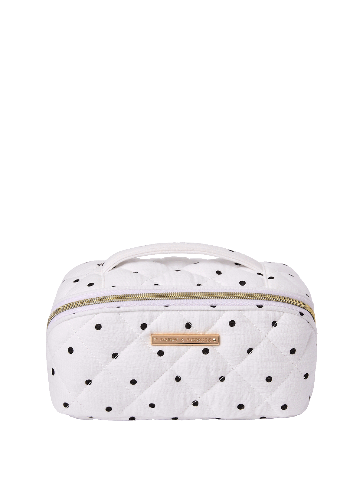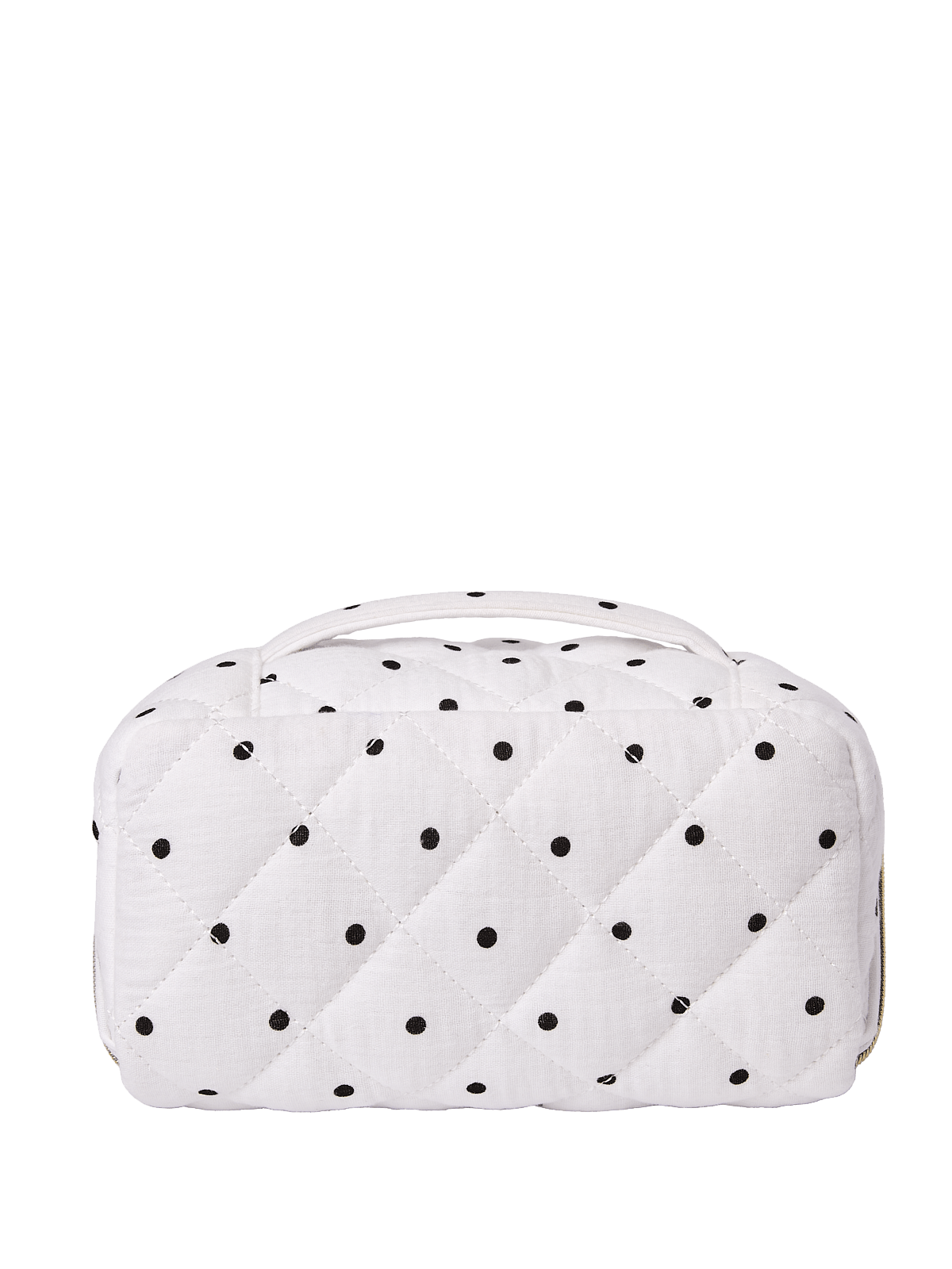 A quilted makeup bag so versatile, you'll wonder how you ever went without it. A must-have for any traveller, this festive makeup bag has a wipeable lining with two large interior compartments, interior slide pockets, a transparent centre compartment, as well as a jewelry tab to keep you organized.