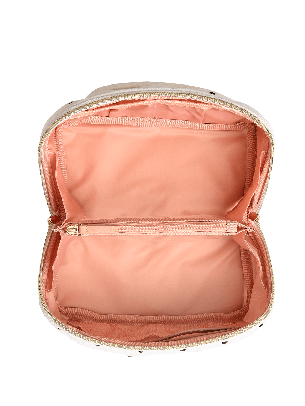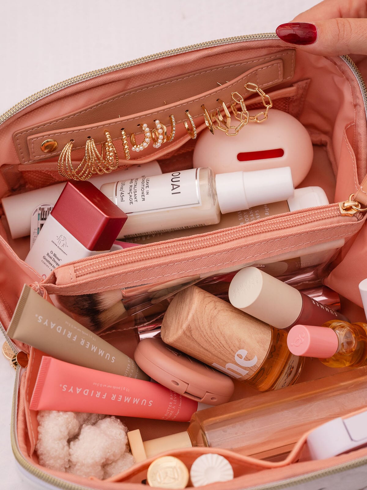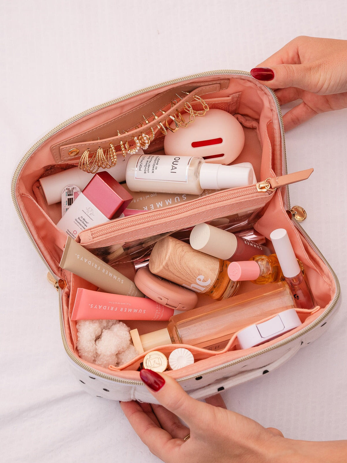 A quilted makeup bag so versatile, you'll wonder how you ever went without it. A must-have for any traveller, this festive makeup bag has a wipeable lining with two large interior compartments, interior slide pockets, a transparent centre compartment, as well as a jewelry tab to keep you organized.