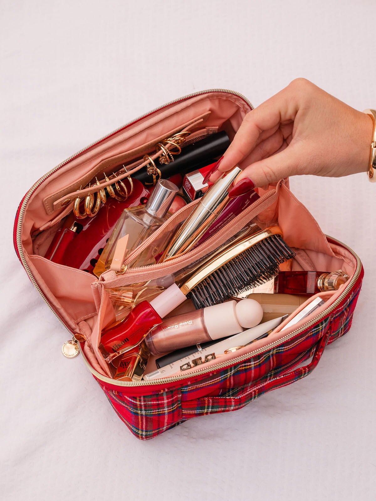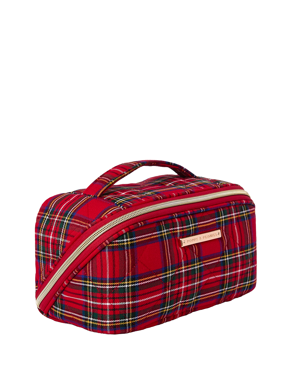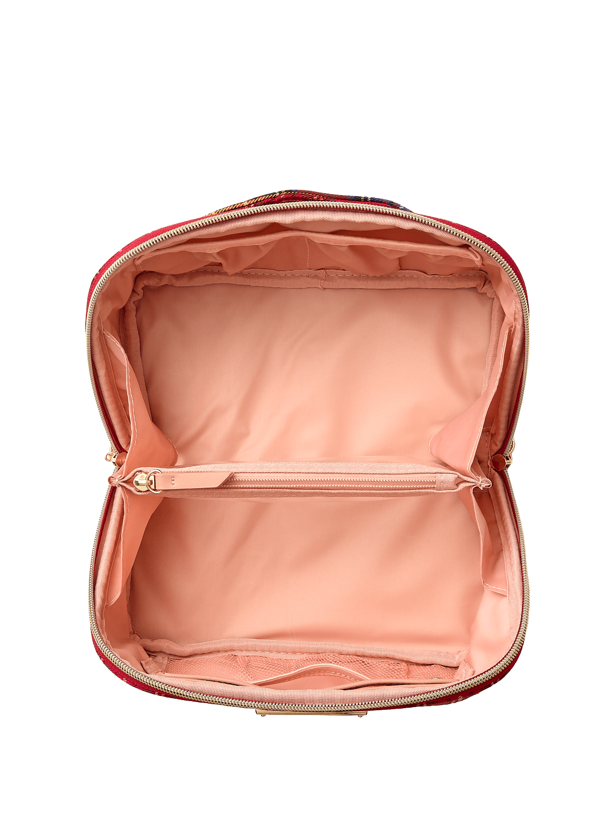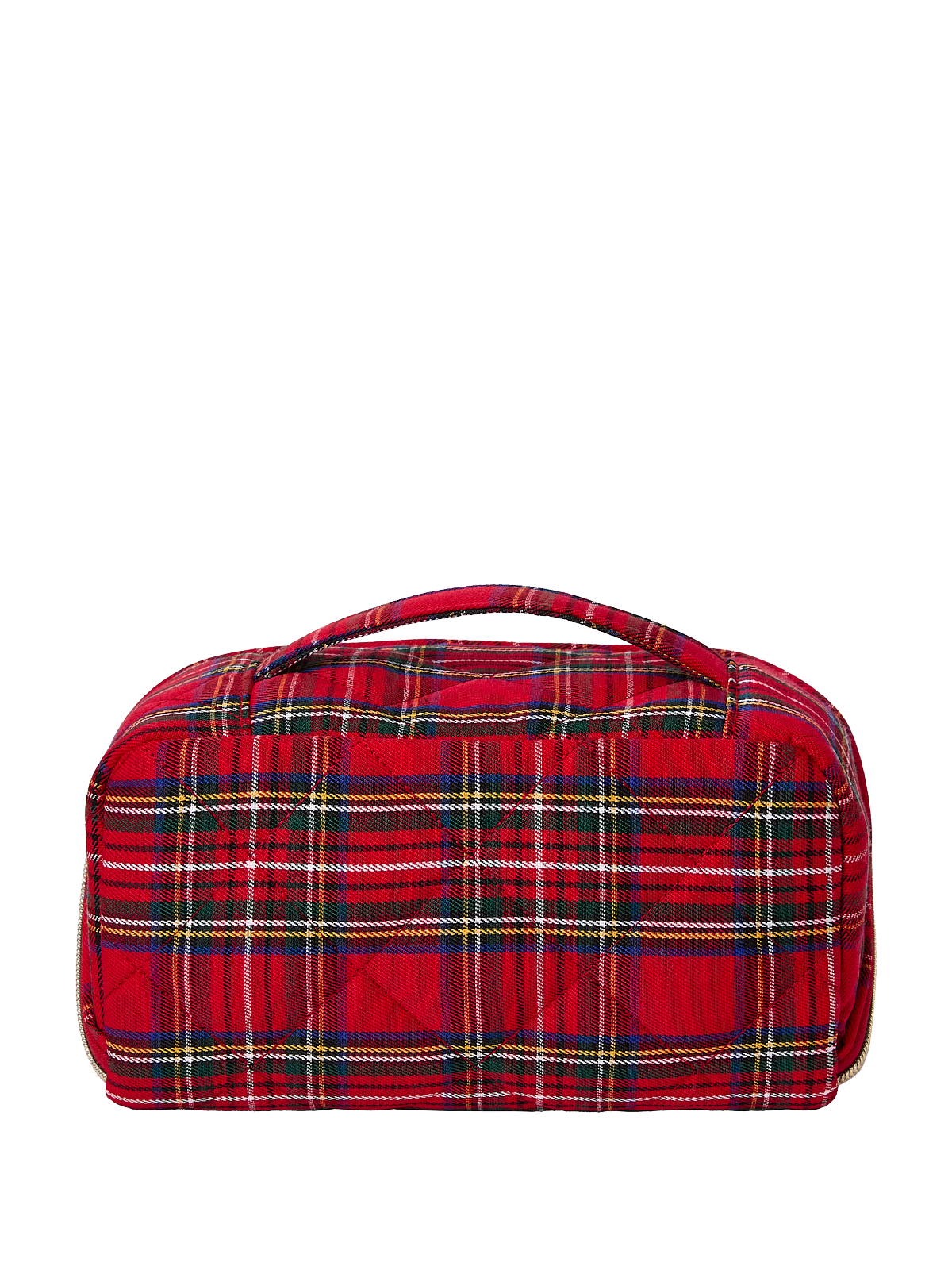 A quilted makeup bag so versatile, you'll wonder how you ever went without it. A must-have for any traveller, this festive makeup bag has a wipeable lining with two large interior compartments, interior slide pockets, a transparent centre compartment, as well as a jewelry tab to keep you organized.