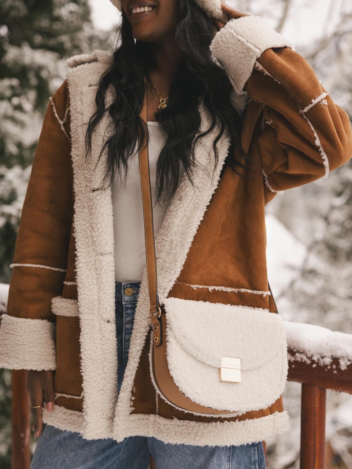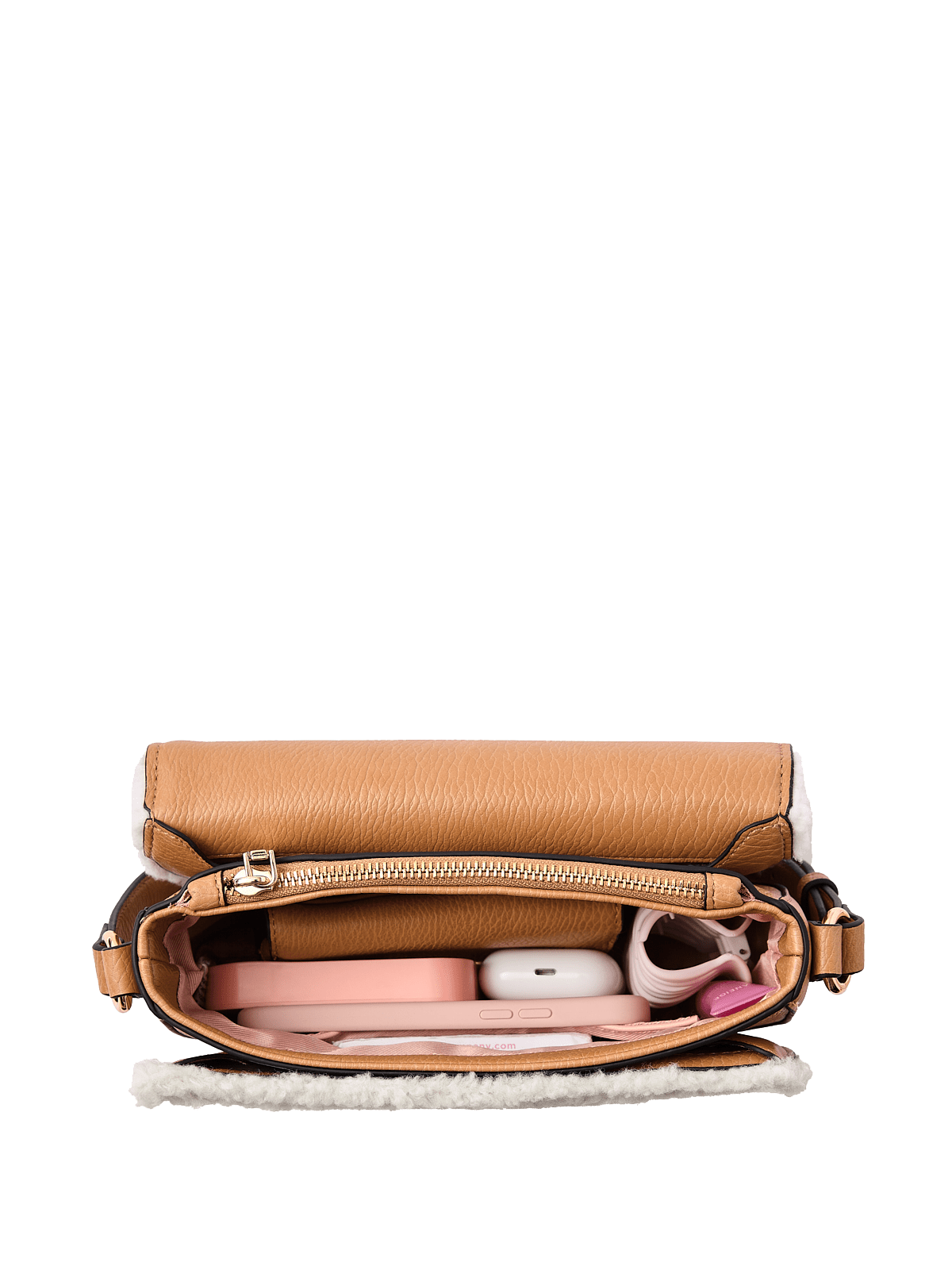 Perfect for a day out with girlfriends, a date night, or shopping, this sleek crossbody is a true statement piece. It features an adjustable strap, signature push lock, accordion-style organization with two slide pockets, two zip compartments, and a roomy main section. An exterior back pocket keeps essentials within easy reach. Crafted in faux fur.