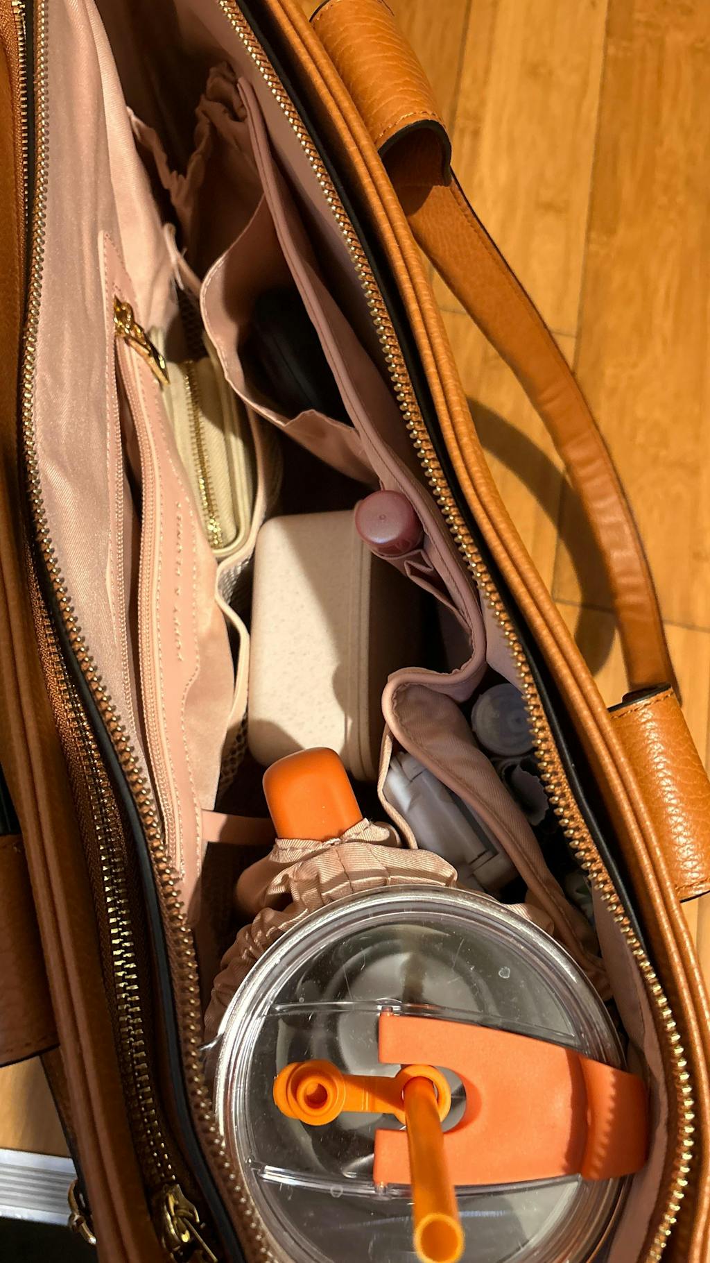 - Interior water bottle pocket, zipper pocket and key leash, two lipstick pockets, additional pocket and two large mesh pockets
