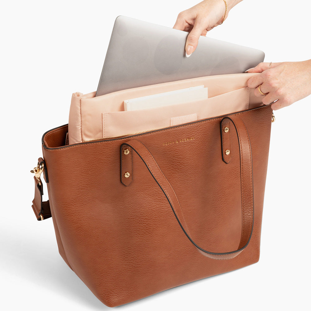 The Go-Getter was designed to carry all of life’s daily essentials with room to spare. Our spacious, all-in-one tote is sleek and sophisticated without compromising on function. Protect your laptop with a stylish, removable 16-inch padded laptop sleeve. Features an interior water bottle pocket, ample interior storage and organization including designated pockets just for lipstick.....yes! The top zip closure will keep your belongings safe and secure and the convenient trolley sleeve makes it easy attach to your luggage so you can navigate the airport with ease.