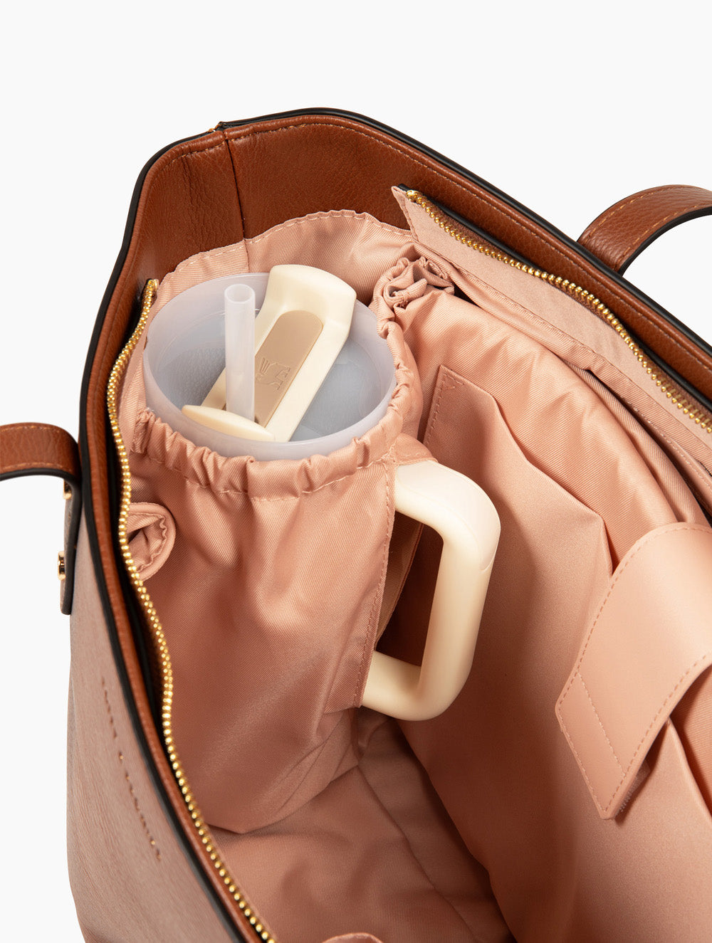 • Interior water bottle pocket, zipper pocket, key leash, two lipstick pockets and additional slide pockets.