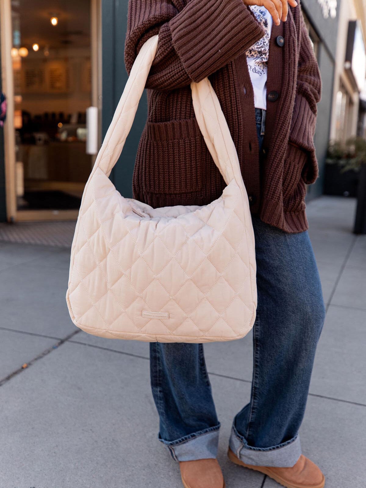 A quilted companion to take you from desk to dinner. Versatile, roomy, and reliable, the Haul It Hobo adapts to whatever the day brings your way. With its ample interior, including a designated pocket for your Stanley tumbler as well as an pocket for a standard water bottle, removable laptop sleeve and interior compartments, the Haul It ensures you'll have room for everything you need.  A top zipper closure keeps your necessities where you want them and the back slide pocket gives you easy access to your phone. Crafted in a quilted washed nylon with tonal hardware.