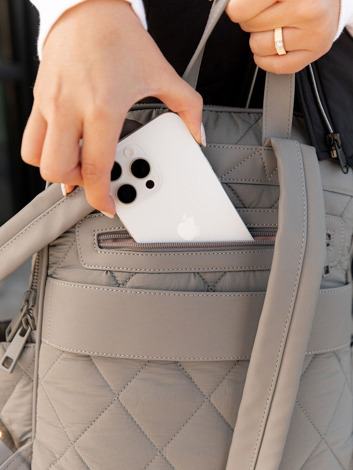 For work, weekend, or travel, the Quilted Brooklyn can handle all your day-to-day essentials. Includes a padded 15" laptop sleeve, expandable side water bottle pockets, and a smart interior with a Stanley cup holder, mesh pockets, a key leash and compartments to keep you organized in style. Features front zipper pocket, padded and adjustable straps, and a back zipper pocket. The top handles allow you to grab-and -go or use the handy luggage slide to secure the backpack to your suitcase and breeze through the airport. Available in Black, Grey, Leopard, Blush and Espresso