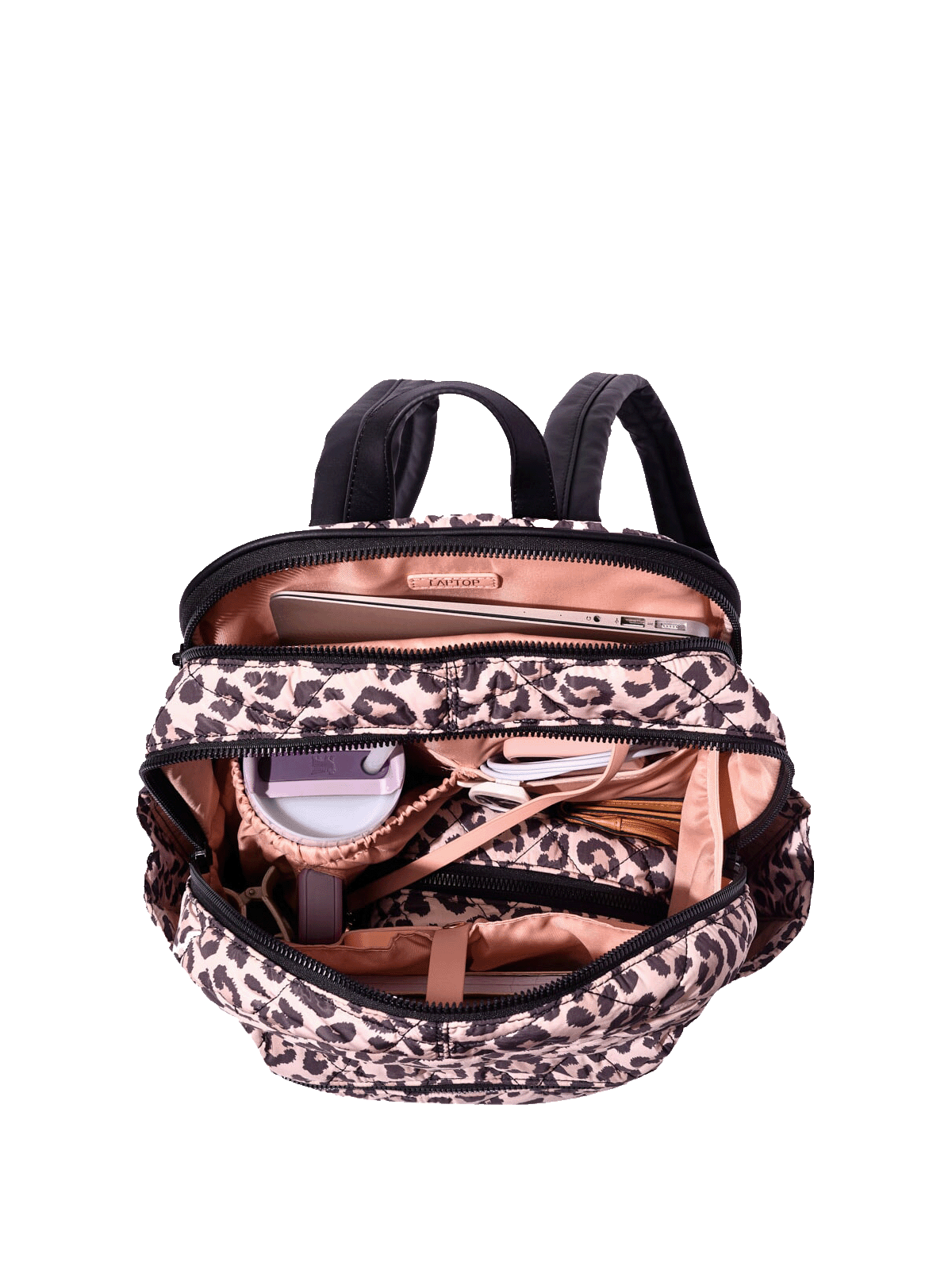 For work, weekend, or travel, the Quilted Brooklyn can handle all your day-to-day essentials. Includes a padded 15" laptop sleeve, expandable side water bottle pockets, and a smart interior with a Stanley cup holder, mesh pockets, a key leash and compartments to keep you organized in style. Features front zipper pocket, padded and adjustable straps, and a back zipper pocket. The top handles allow you to grab-and -go or use the handy luggage slide to secure the backpack to your suitcase and breeze through the airport. Available in Black, Grey, Leopard, Blush and Espresso