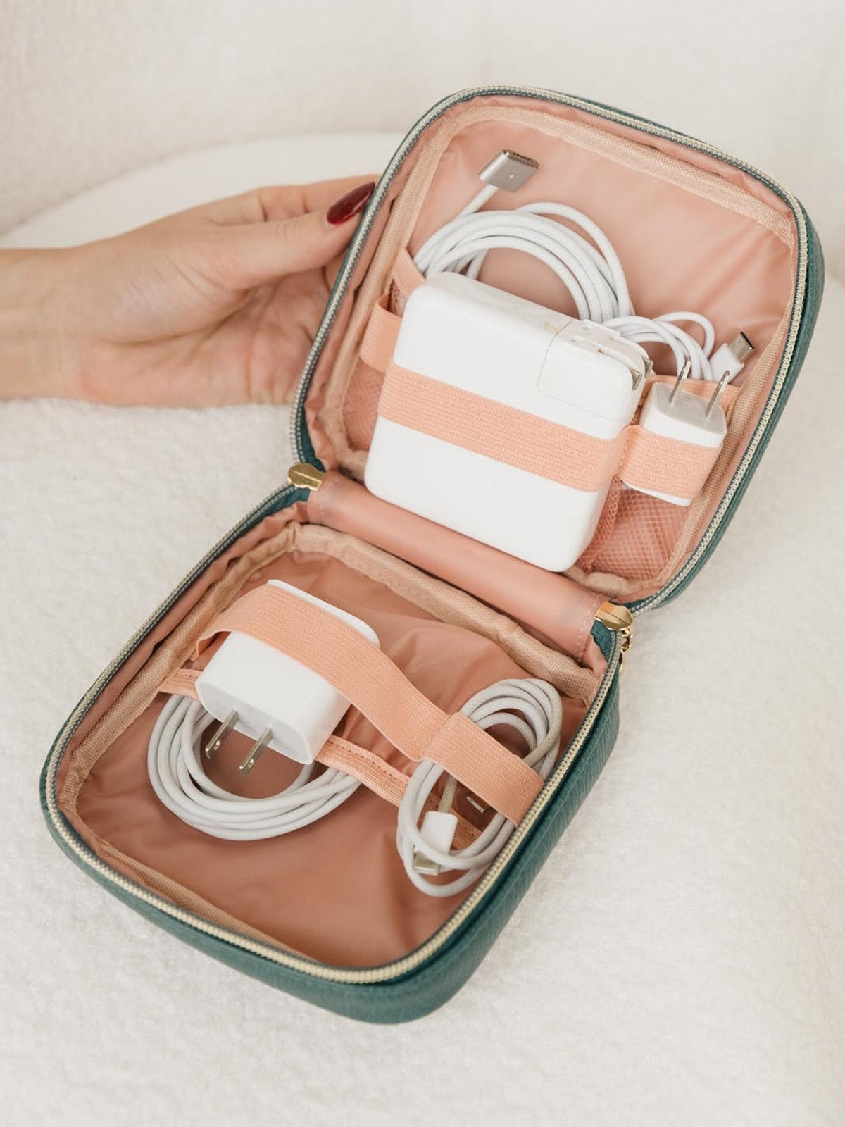 Say goodbye to lost chargers and tangled cords.This compact cube has everything you need to stay organized on the go. The Teched Out features a slide pocket, mesh pouch, and sturdy elastic straps to safely stow chargers, cords, earbuds, and more. Fits perfectly into your Go Getter, Tote It, or Commuter for hassle-free storage for the office and travel.