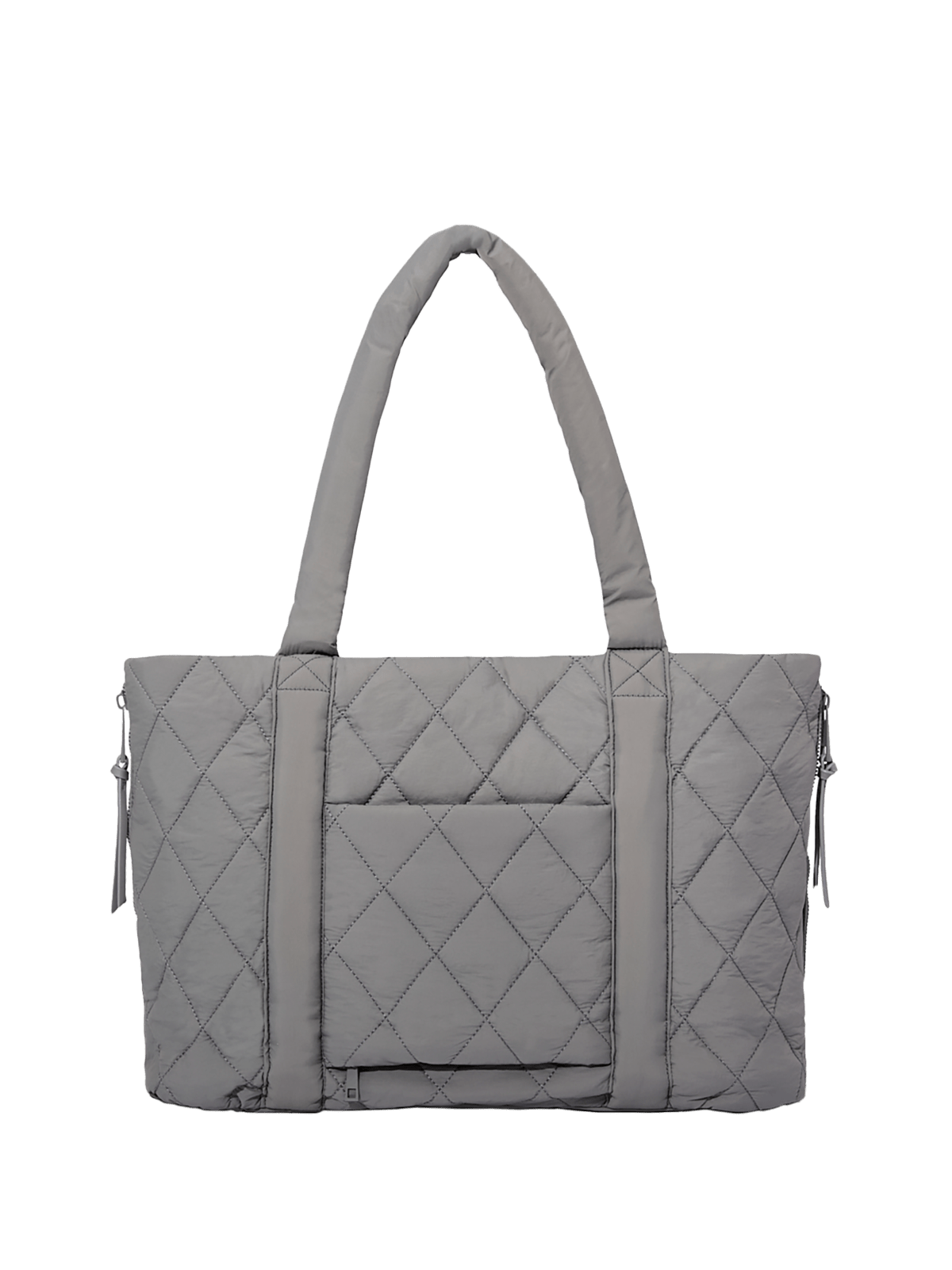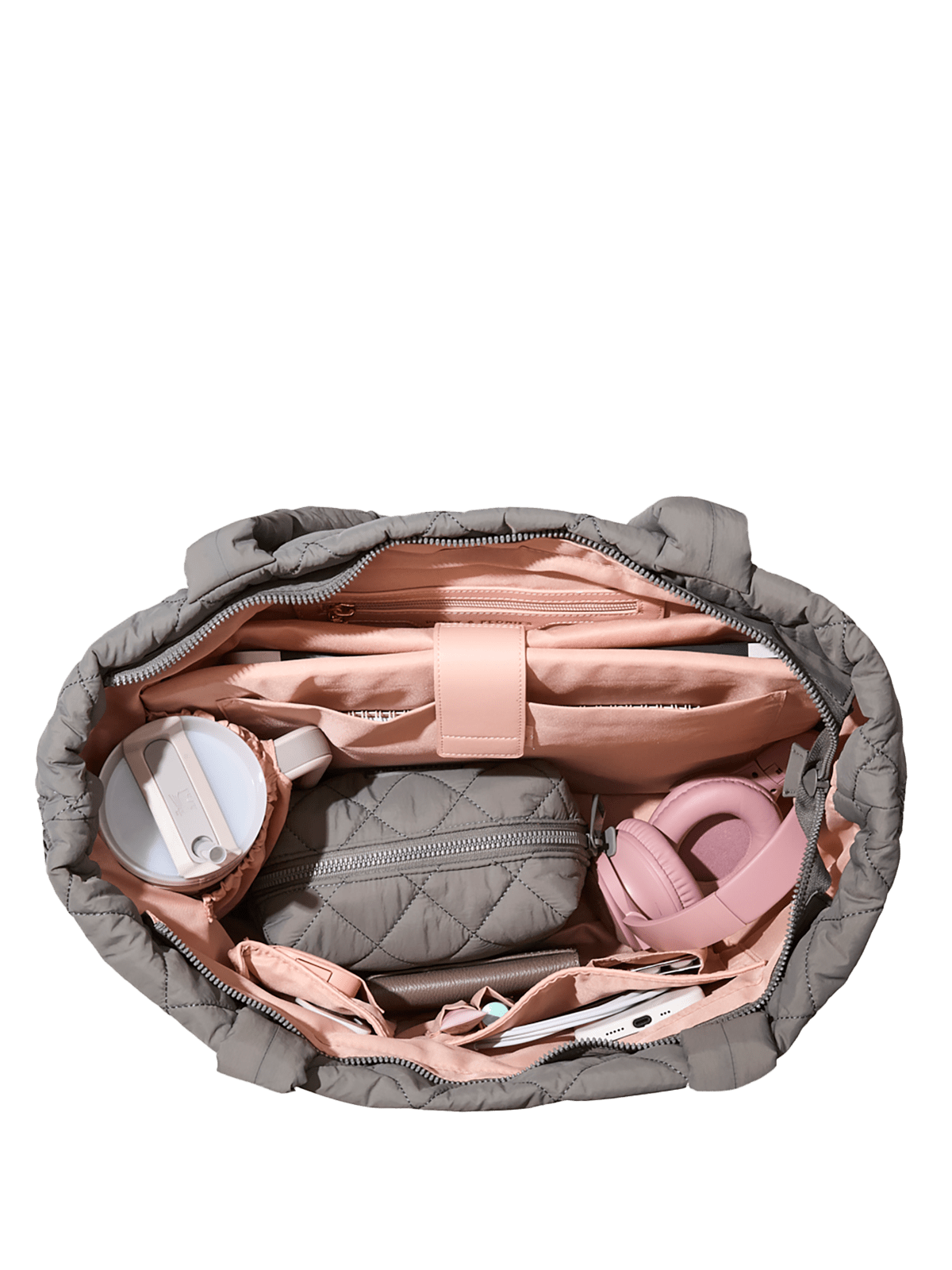 The bigger the bag, the greater the possibilities. From long days at the office to spontaneous weekends away, the plentifully proportioned Tote It is up for anything. Its 16.5 inch laptop sleeve, Stanley water bottle pockets, and key leash make it an ideal all-in-one for your workweek. Out of office? Ditch the laptop compartment for extra space, and use the built-in trolley sleeve to navigate your travel plans with ease. Sneaky side zipper pockets give you even more storage when you need it. Crafted in quilted washed nylon with tonal hardware.