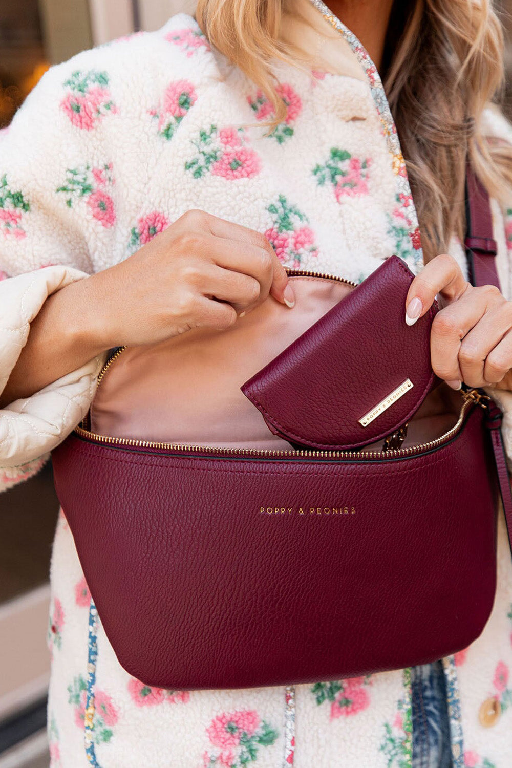 Carry it your way with the removable crossbody strap, by hand, over the shoulder, or hands-free. On travel days, the back trolley sleeve slides over your luggage handle and converts into a slide pocket when not in use. Crafted from soft vegan leather and available in Black, Cognac and Berry.