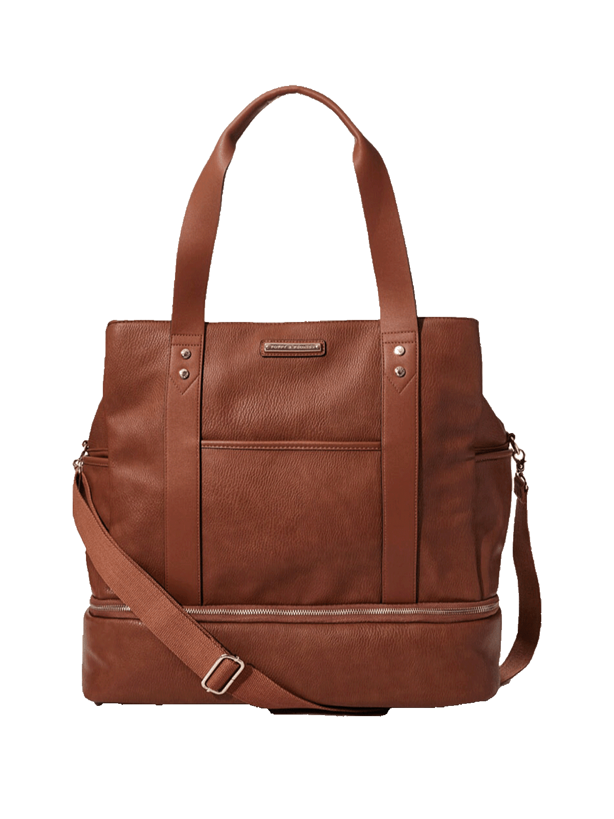 The Voyager lets you travel anywhere with ease. Bring it on board your next flight, girls getaway or use it as a new-mom carryall. Store shoes, snacks, or bottles in the spacious bottom zip compartment, and keep your valuables safe and organized with the interior jewelry tab, keychain attachment, and secure zipper pocket. The roomy, wipeable interior, sleek yoga mat carrier make it a perfect gym bag. The convenient trolley slide makes it easy attach to your luggage so you can navigate the airport with ease. Crafted in vegan leather.