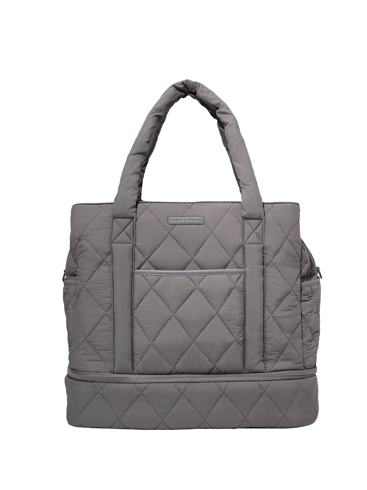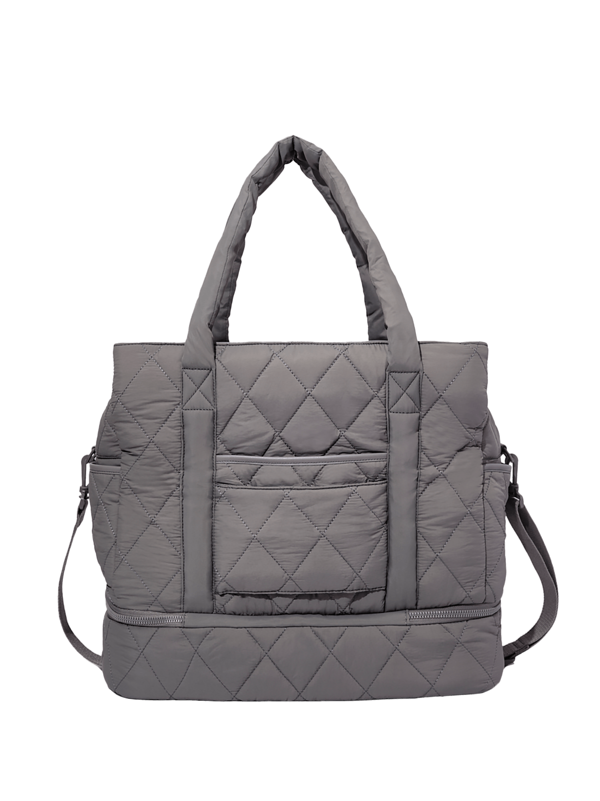 The Voyager lets you travel anywhere with ease. Bring it on board your next flight, girls getaway or use it as a new-mom carryall. Store shoes, snacks, or bottles in the spacious bottom zip compartment, and keep your valuables safe and organized with the interior jewelry tab, keychain attachment, and secure zipper pocket. The roomy, wipeable interior, sleek yoga mat carrier make it a perfect gym bag. The convenient trolley slide makes it easy attach to your luggage so you can navigate the airport with ease. Crafted in washed nylon.