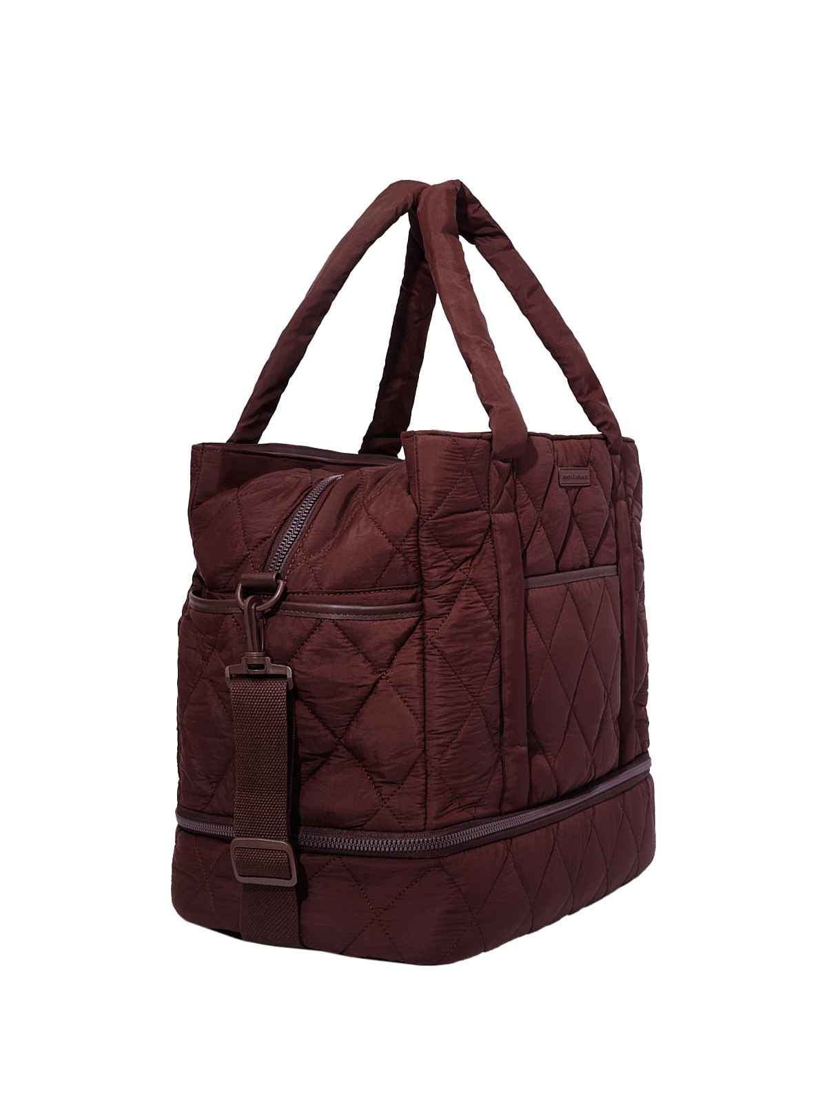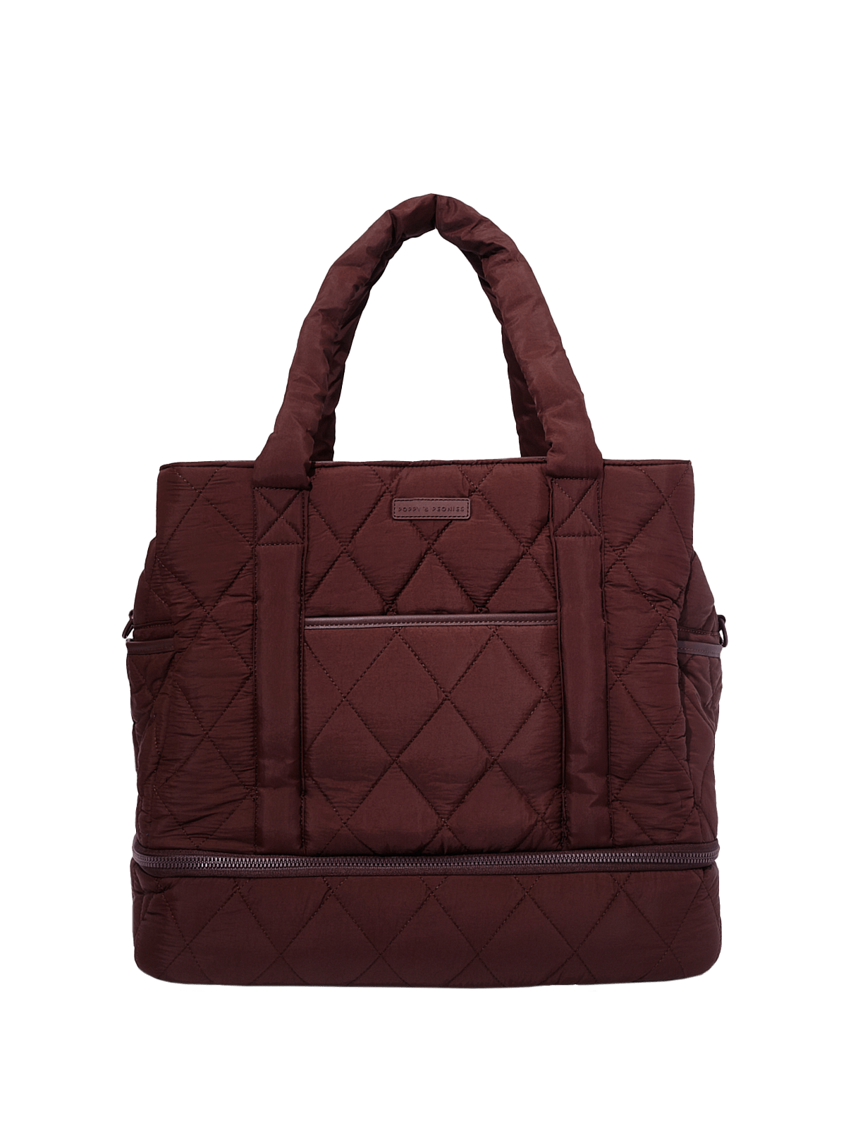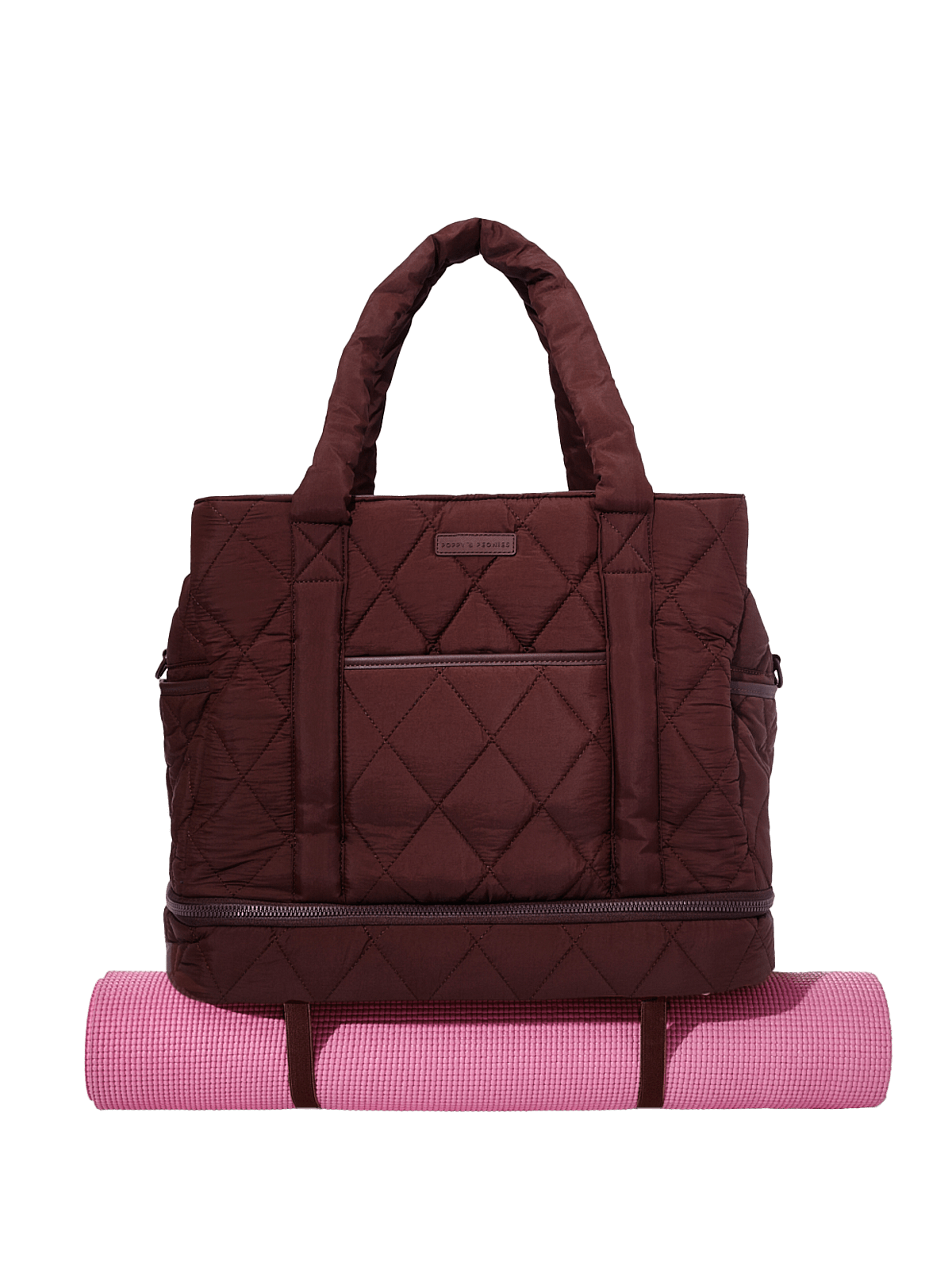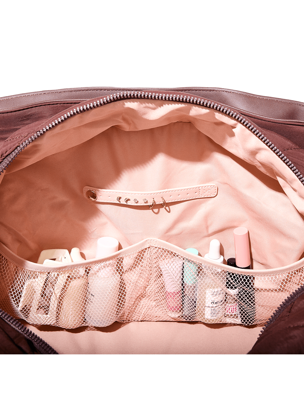 The Voyager lets you travel anywhere with ease. Bring it on board your next flight, girls getaway or use it as a new-mom carryall. Store shoes, snacks, or bottles in the spacious bottom zip compartment, and keep your valuables safe and organized with the interior jewelry tab, keychain attachment, and secure zipper pocket. The roomy, wipeable interior, sleek yoga mat carrier make it a perfect gym bag. The convenient trolley slide makes it easy attach to your luggage so you can navigate the airport with ease. Crafted in washed nylon.