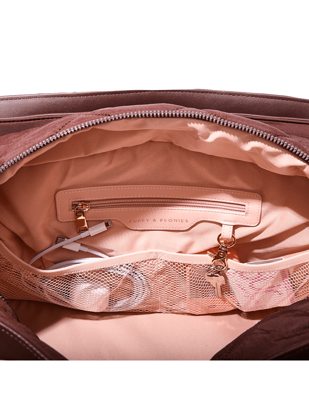 • Large bottom zipper compartment with mesh zipper pocket and wipeable lining